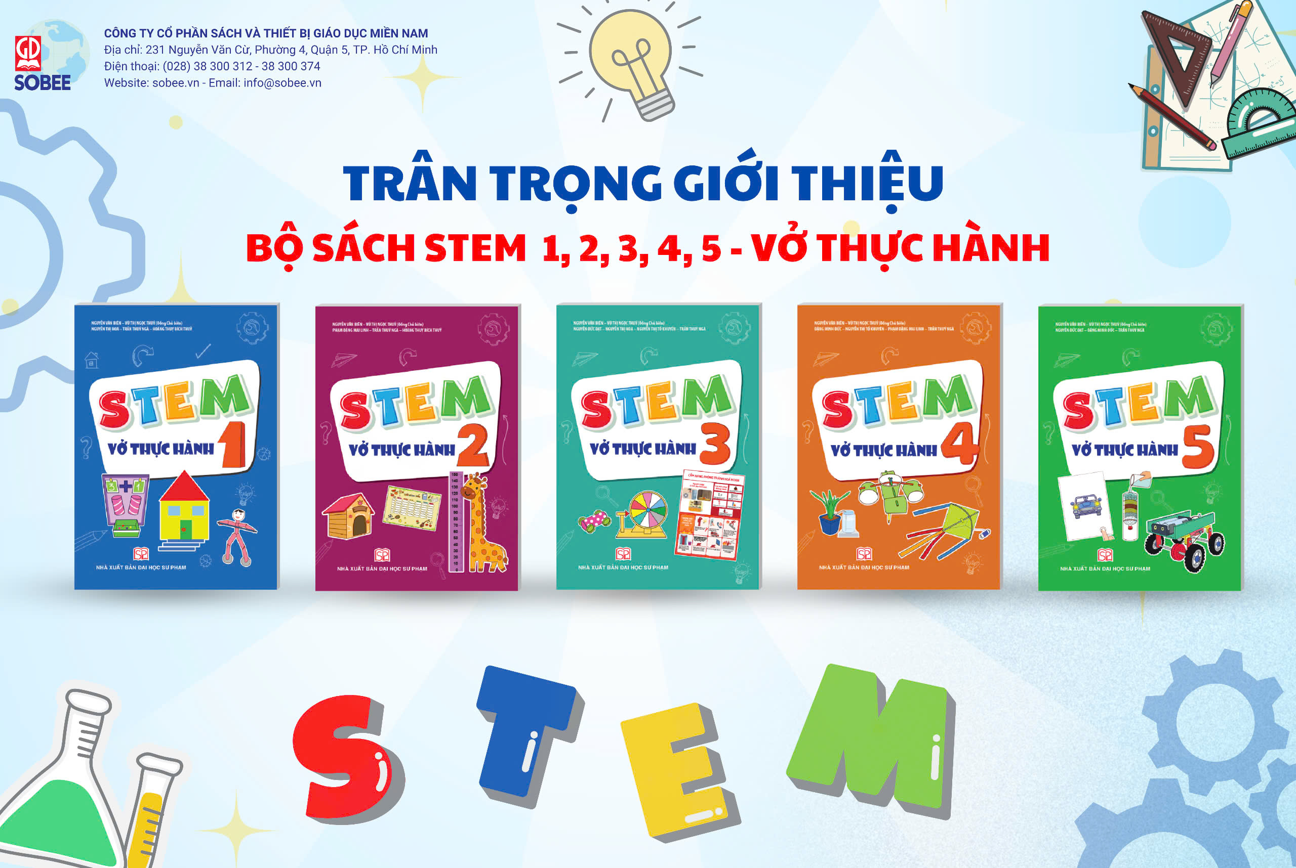 Để hỗ trợ giáo viên, học sinh dạy học STEM hiệu quả hơn, học sinh được tiếp cận với các bài học STEM theo tâm sinh lí và trình độ phù hợp dễ dàng hơn; Công ty CP Sách và Thiết bị Giáo dục Miền Nam trân trọng giới thiệu bộ sách: “STEM 1, 2, 3, 4, 5 – VỞ THỰC HÀNH”, do Nhà xuất bản Đại học Sư phạm xuất bản.