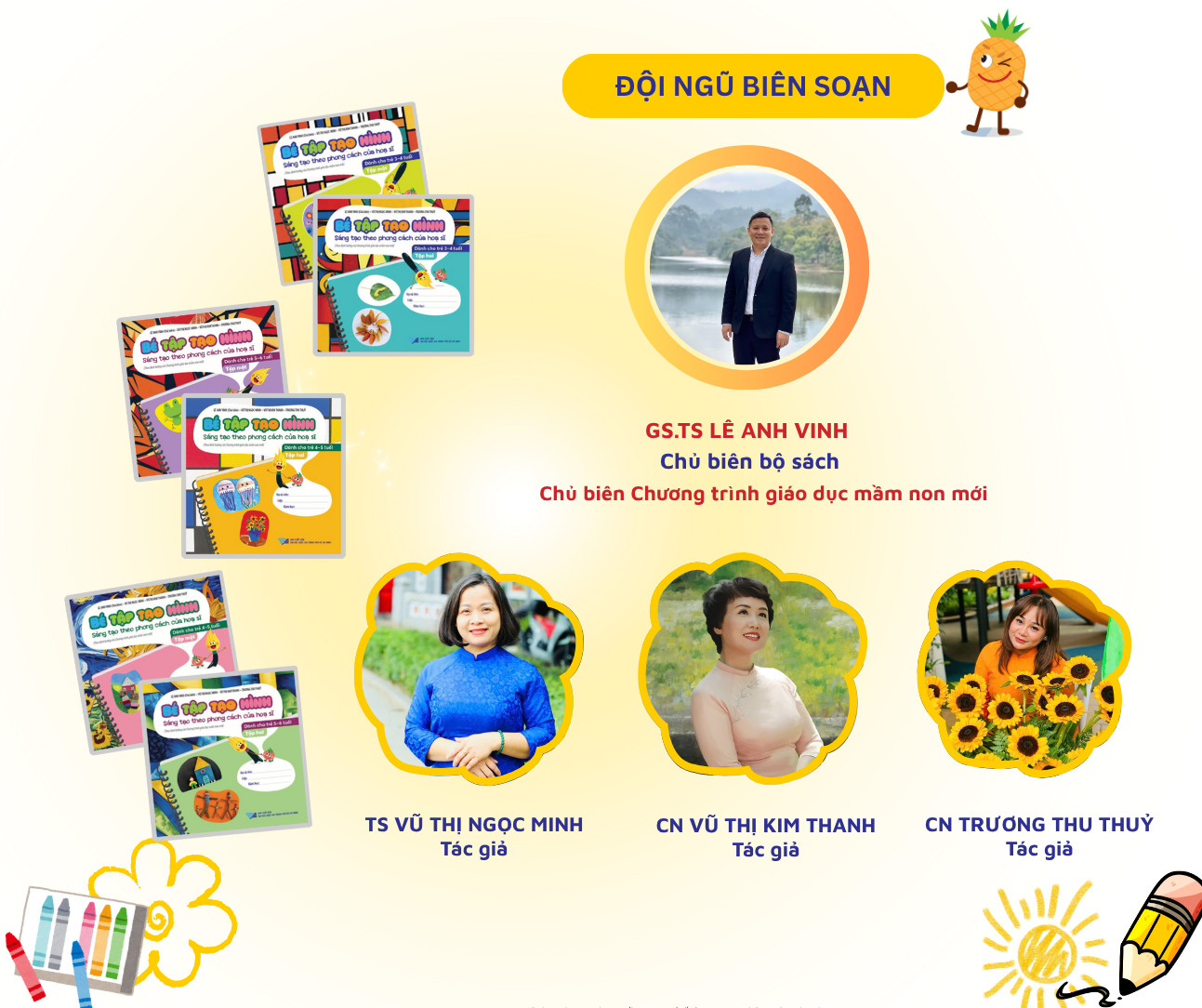 Đội ngũ tác giả đã tham gia biên soạn Chương trình giáo dục mầm non (CTGDMN) hiện hành, đồng thời cũng là các thành viên trong Ban biên soạn CTGDMN mới. Trong đó, chủ biên bộ sách GS. TS Lê Anh Vinh – Viện trưởng Viện Khoa học Giáo dục Việt Nam là chủ biên chương trình Giáo dục mầm non mới.